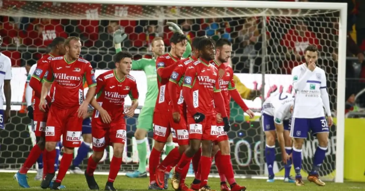 Anderlecht a un peu du mal dans ce nouveau système et après à peine 7 minutes de jeu, le KVO ouvre le score. Après avoir chipé le ballon à Chipciu, Bjelica adresse un centre vers Akpala que Dendoncker pousse maladroitement dans ses propres filets, 0-1.