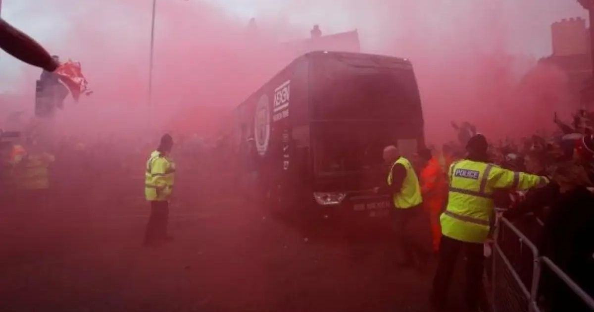 Des centaines de supporters des Reds ont accueilli le car des Citizens dans les rues qui entourent le stade d'Anfield. Ils l'ont fait avec des fumigènes à l'appui un peu plus d'une heure avant le match. Parmi ceux-ci, certains ont décidé de lancer des cannettes et des bouteilles qui ont endommagé les vitres. Selon plusieurs médias britanniques, les Skyblues se mettraient à l'oeuvre pour dénicher un autre bus pour effectuer le retour vers Manchester plus tard dans la soirée.