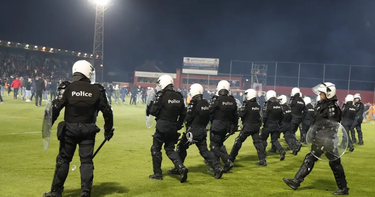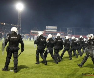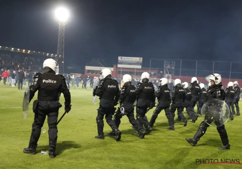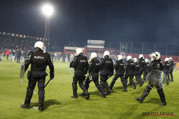 Après plusieurs lancers de pétards, de fumigènes et bagarres entre supporters, les policiers ont dû monter sur le terrain pour repousser les supporters molenbeekois dans les tribunes qui ont montré une piètre image de leur club.