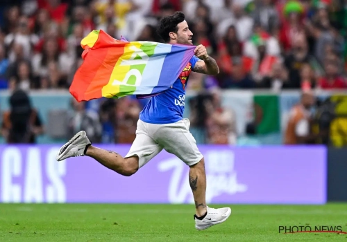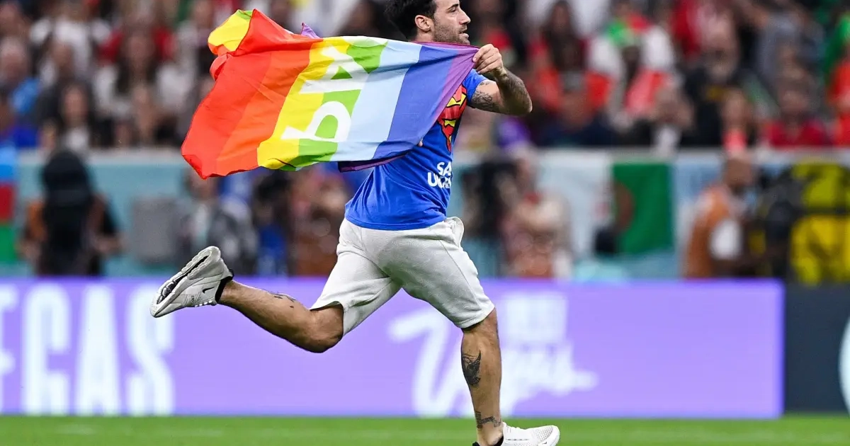 Alors que la rencontre Portugal - Uruguay bat son plein, un supporter a fait irruption sur la pelouse du stade, arborant plusieurs messages.