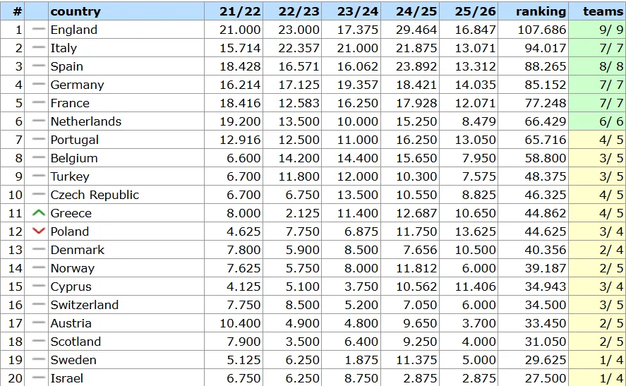 En effet, le Portugal, qui perdra 12.916 points au terme de la saison contre 6.600 pour la Belgique, vient de rattraper son retard et a subtilisé la sixième place virtuelle de nos clubs en 2027, les Pays-Bas étant actuellement huitièmes avec un retard certain. La Belgique devrait donc bel et bien gagner une place par rapport à cette saison, mais pas deux, comme cela aurait été possible en cas de meilleurs résultats globaux.